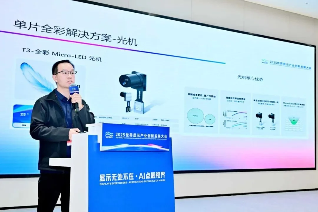 During the “Micro-LED Thematic Presentation” session, Dr. Song delivered a keynote titled “Micro-LED Microdisplays: Enabling the Era of Full-Color AR Glasses.” In his presentation, he highlighted full-color capability, lightweight design, and mass production readiness as the core development directions for AR microdisplays. He introduced Saphlux’s monolithic full-color solution based on its proprietary NPQD® technology, which integrates RGB subpixels on a single blue wafer, delivering high luminous efficiency, compact form factor, and cost advantages. He also outlined the company’s mass production capabilities and the S·ONE smart AR glasses solution.